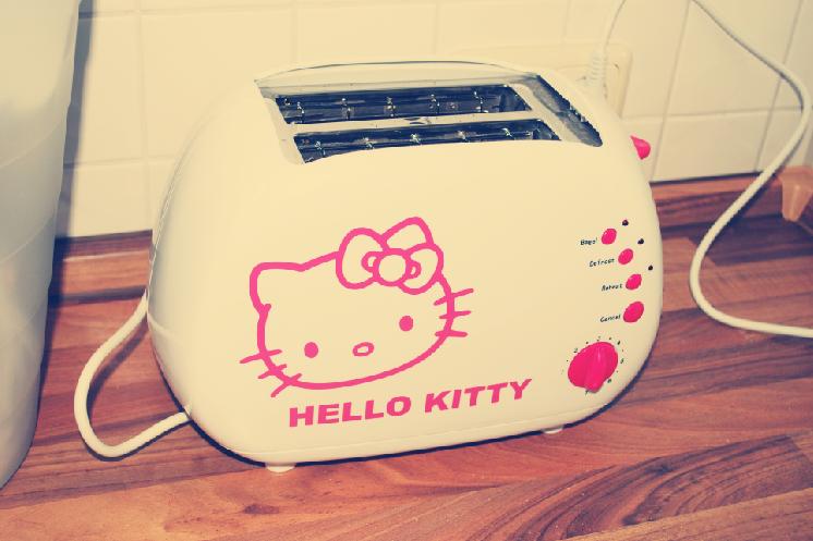 Und zum Schluss: das allerallerbeste Einzugsgeschenk von Illa. Ein Hello Kitty Toaster, der Gesichter auf die Toasts brennt. AH ! Is ja so: Entweder man liebt das Ding, oder wills besser selber direkt verbrennen. Ich gehöre zur Fangemeinschaft und steh dazu! Und ich glaube der Toast schmeckt gleich ein bisschen besser…
