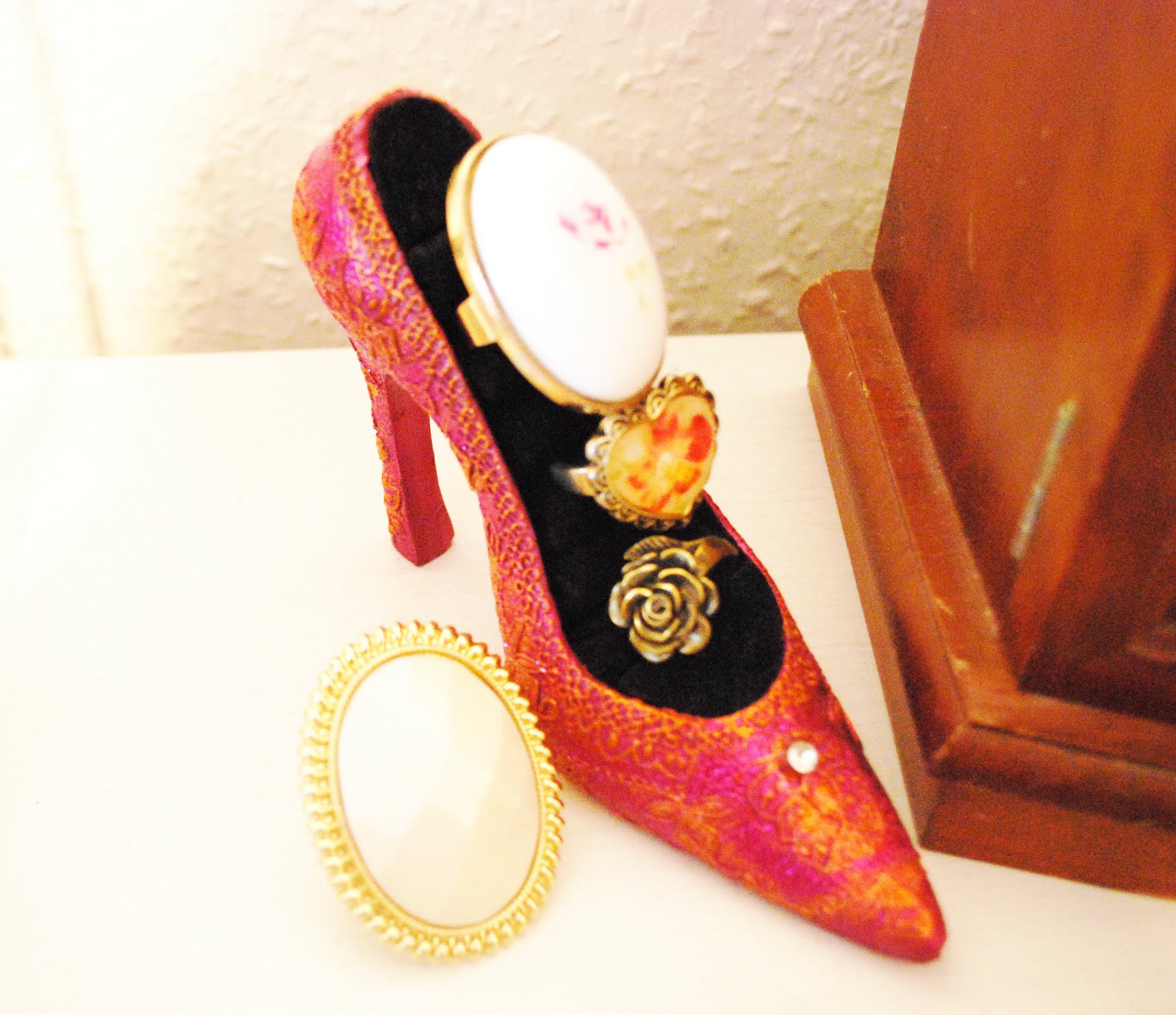 Den Schmuckschuh hat Mutti mir letztens mitgebracht. Ich find ihn ganz witzig und deswegen darf er auch ins Zimmer einziehen. Der fette Ring ist von PRIMARK, der Rest von H&M, Accessorize und Six