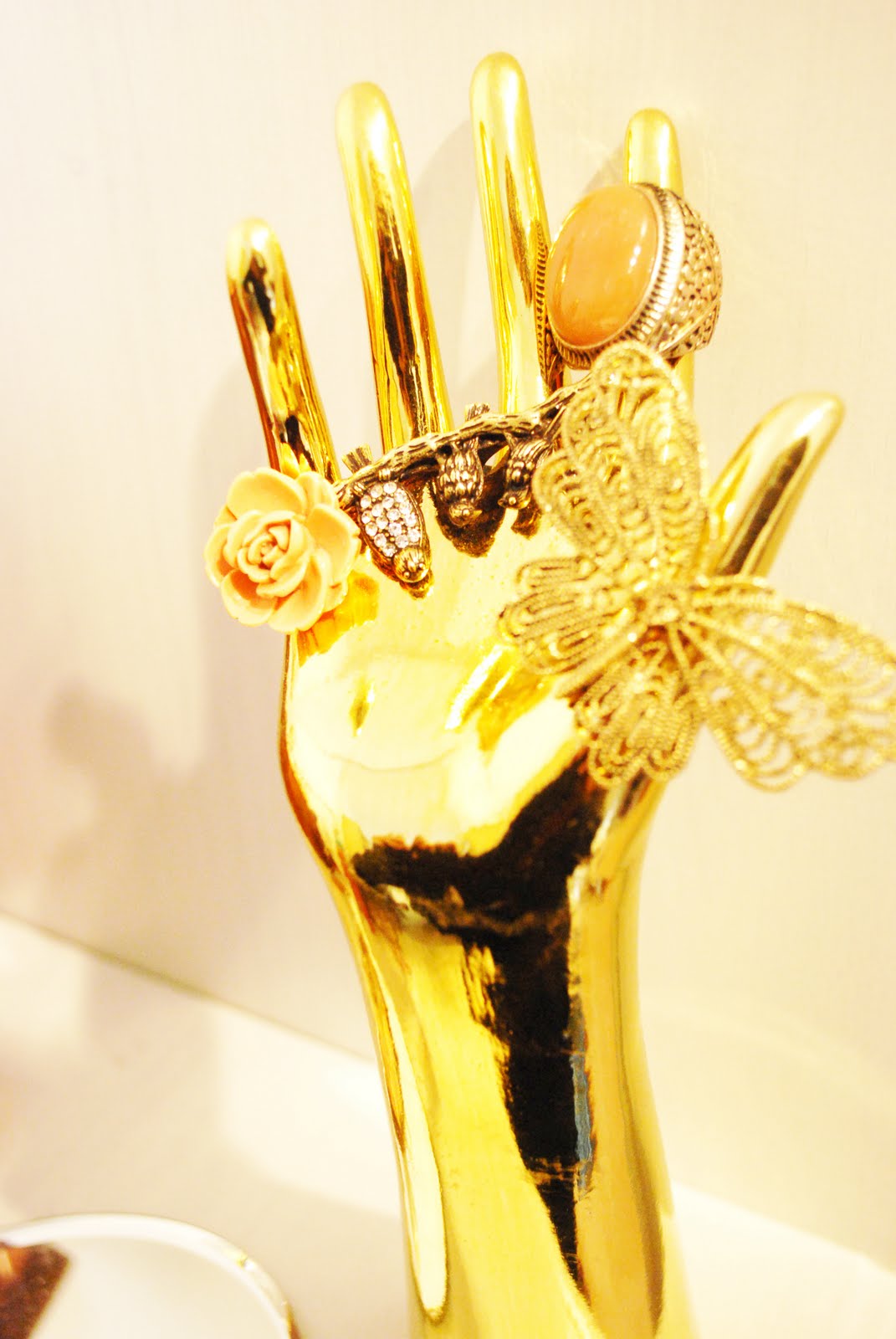 Meine goldene Schmuckhand hat endlich einen Platz im Ankleidezimmer bekommen. Ringe (v.l.n.r.): New Look, PRIMARK, H&M, H&M