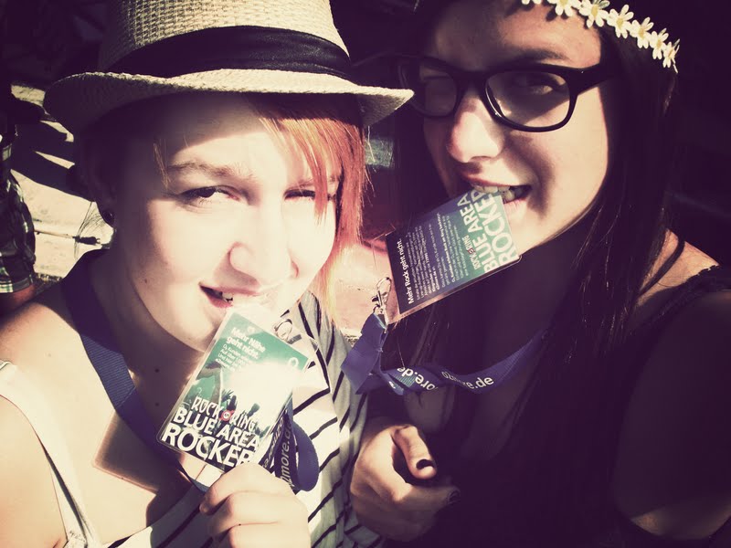 Ilka guckt ein bisschen gegen die Sonne, aber unsere Backstage – Pässe fanden wir mega cool