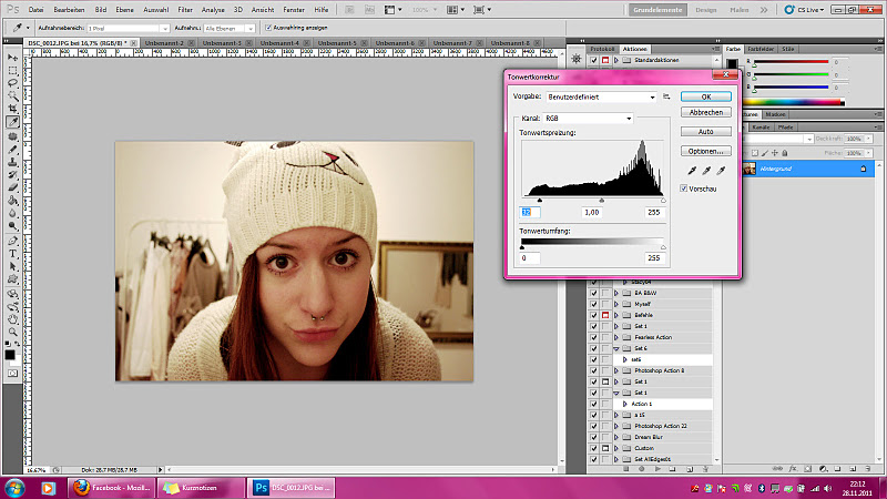 9. Der weiße rechte Pfeil ist für die hellen Farben, der in der Mitte für die „mittelhellen“ und der linke für die dunklen Farben. (Mal vereinfacht gesagt). Wir klicken nun den rechten Pfeil an und schieben ihn ein bisschen mehr zur Mitte. Dein Bild sollte jetzt einen stärkeren Kontrast haben. Schieb ihn soweit, bis zu zufrieden bist.