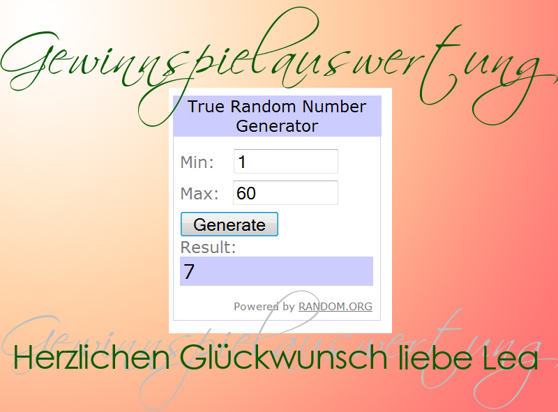 Am 24.12.2011 bekommt man die Geschenke. Eigentlich. Denn da ist ja Weihnachten. Ilka und ich haben uns gedacht, wir fangen da mal an mit dem Countdown für ein unweihnachtliches Geschenk. Wie ihr bestimmt aus DIESEM POST wisst, startete da der Run auf die Goodies! Alles hat ein Ende, deswegen kommt nun hier die Gewinnspielauswertung. Mitgemacht haben 60 Leute und ausgelost wurde per random.org! Und tadaa – die (hoffentlich) Glückliche Gewinnerin unseres fetten Paketes ist: