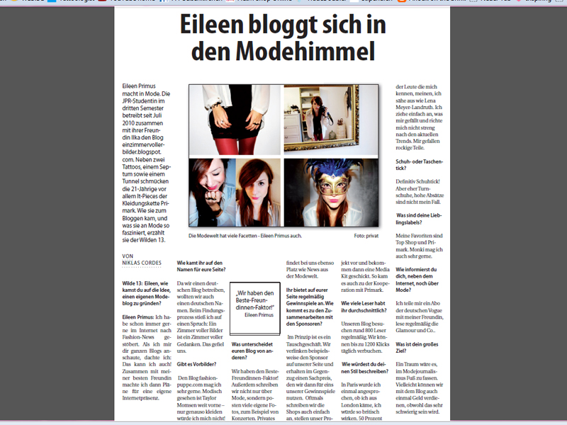 Als zweites hab ich mein gewonnenes Kameratäschchen im Netz entdeckt. Das hab ich ja beim Contest im Vorfeld zum Fashion Blogger Café gewonnen und habs bei streetstylebystela wiedergesehen. Wie schön Türkis sie doch ist. Das Foto ist auf der Fashion Week entstanden. Und als letztes wurde ich von ein paar Leuten aus meiner Uni interviewt zu meinem Blog. Da sag ich doch nicht nein und das Ergebnis hab ich als Screen mal schnell für euch eingefügt. Falls ihr das Interview lesen wollt, HIER ist der Newsletter. Ich bin auf Seite fünf.